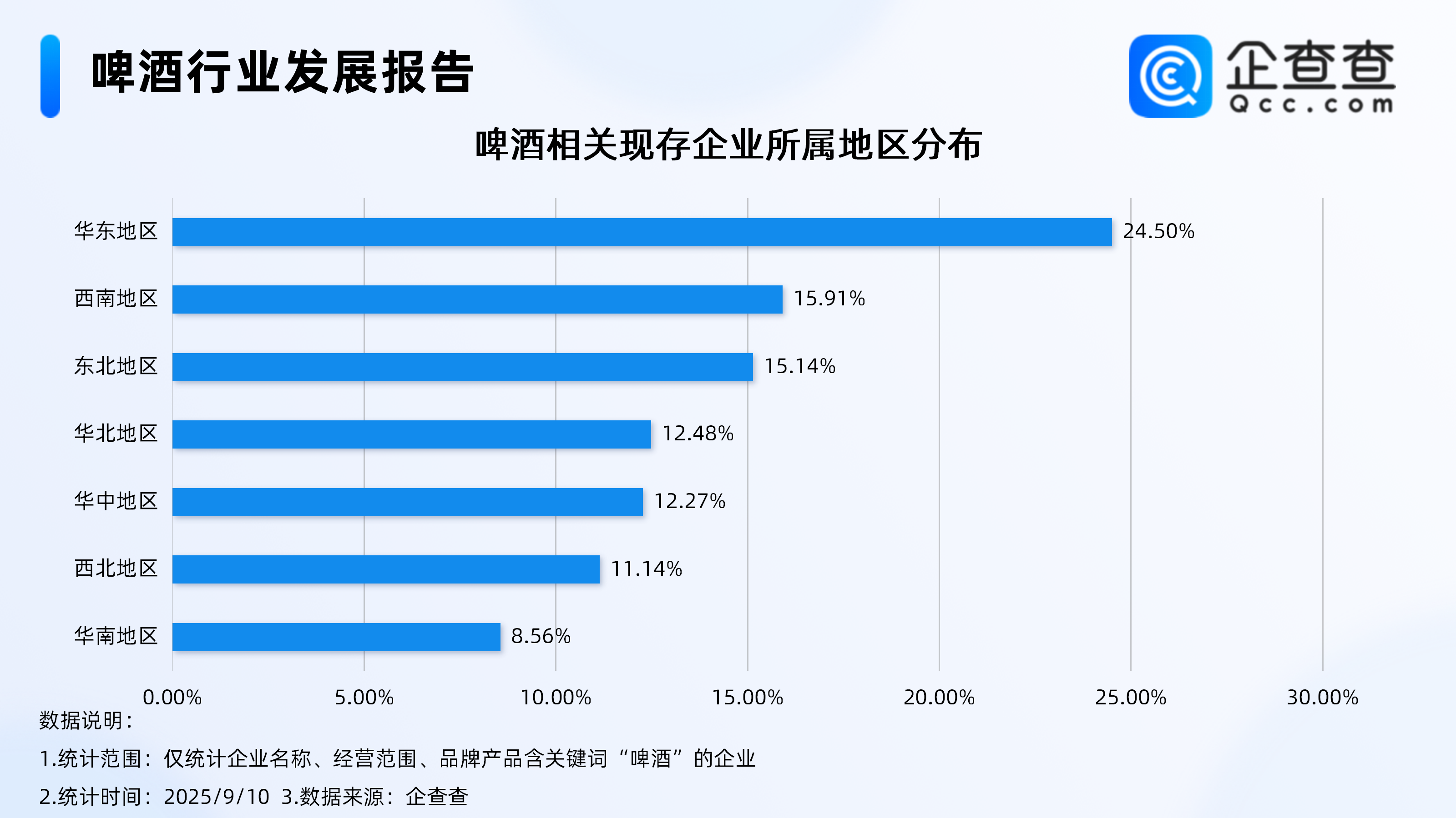 企查查数据显示,截至9月10日,国内啤酒相关企业现存量达6.49万家,主要分布在华东地区,占比达24.5%,其次为西南地区、东北地区,分别占比15.91%、15.14%。